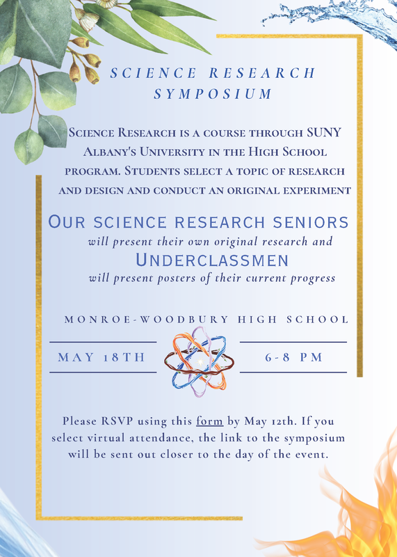 Students enrolled in Monroe-Woodbury High School's Science Research course invite you to their Symposium! Students are required to research a topic of interest, find a mentor to consult with, design and conduct an original experiment, present their research at various competitions to panels of judges, and now to the school community!