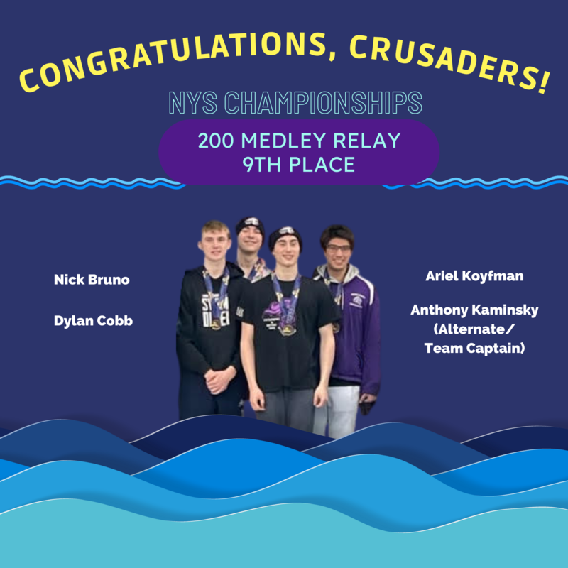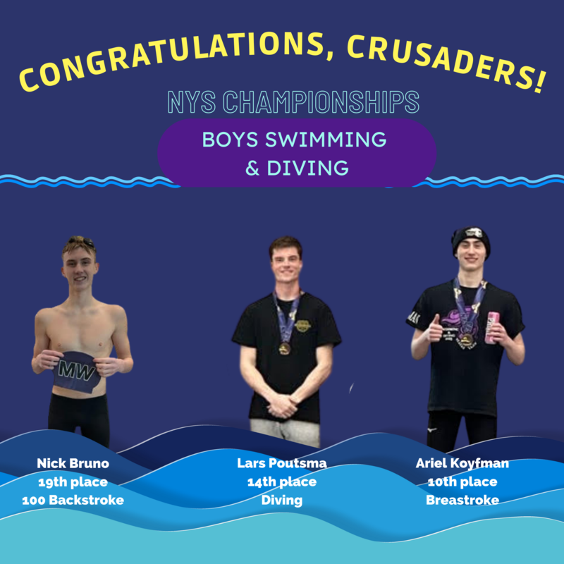 Congratulations to M-W swimmers and divers who capped off an amazing undefeated season (League/Division Champion, Section Champion) with a strong showing at the NYS Championship. Nick Bruno placed 19th in 100 Backstroke; Ariel Koyfman placed 10th in Breaststroke; Lars Poutsma placed 14th in diving; and the 200 Medley Relay team of Bruno/Koyfman/Cobb (alternate: Kaminsky) placed 9th! Well done, Crusaders!