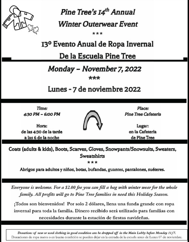 The Outerwear Event will take place on Monday, November 7 from 4:30 p.m. - 6 p.m. in the Pine Tree cafeteria. For a $2.00 fee, families may fill a bag with winter wear for the entire family. All profits will help Pine Tree families in need this holiday season.