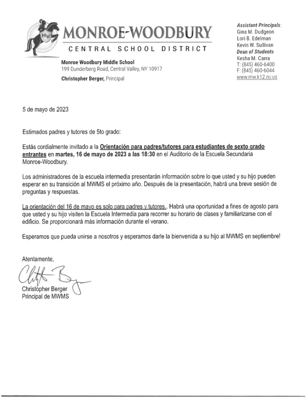 Parents and guardians of incoming 6th graders are invited to attend Orientation on Tuesday, May 16 at 6:30 p.m. in the middle school auditorium. Please note that this orientation is for parents and guardians only. We look forward to seeing you!