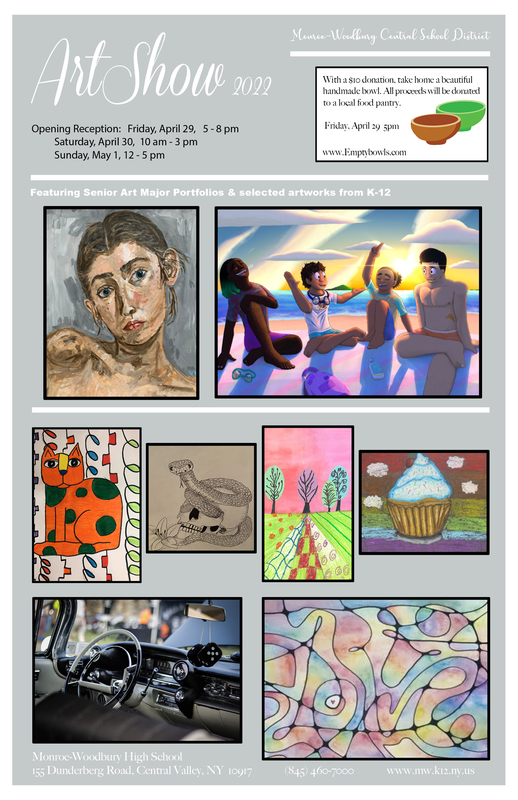 The much anticipated Monroe-Woodbury Annual K-12 District Art Show will be held from Friday, April 29 through Sunday, May 1, 2022 at the Monroe-Woodbury High School lobby. The event features amazing artwork from talented Senior Art Major portfolios and select projects from students of all grades.