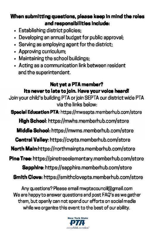 The MWPTA Council Executive Board will be holding a "Meet the Candidates" event on Wednesday, May 11, from 6:30 - 7:30 p.m. in the Monroe-Woodbury High School auditorium.