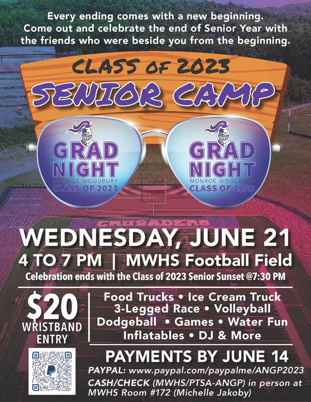 Come spend a night of games, music, food and fun on the field at MWHS on Wednesday, June 21 from 4 pm to 7 pm. The Senior Camp is followed by Class of 2023 Senior Sunset at 7:30 pm. Enjoy an evening with your friends as you bid farewell to Monroe-Woodbury High School.