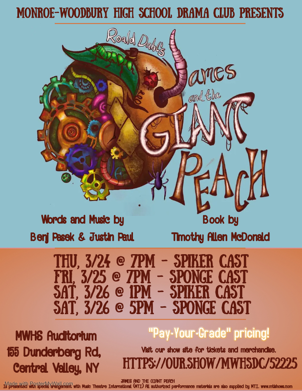 The M-W High School Drama Club proudly presents a musical version of Roald Dahl's beloved story James and the Giant Peach from Thursday, March 24 through Saturday, March 26. Directed by Fay Pacht, this show is wonderful for all ages! It tells the magical story of James and his journey across the sea inside a gigantic peach that is home to a memorable cast of insect characters.