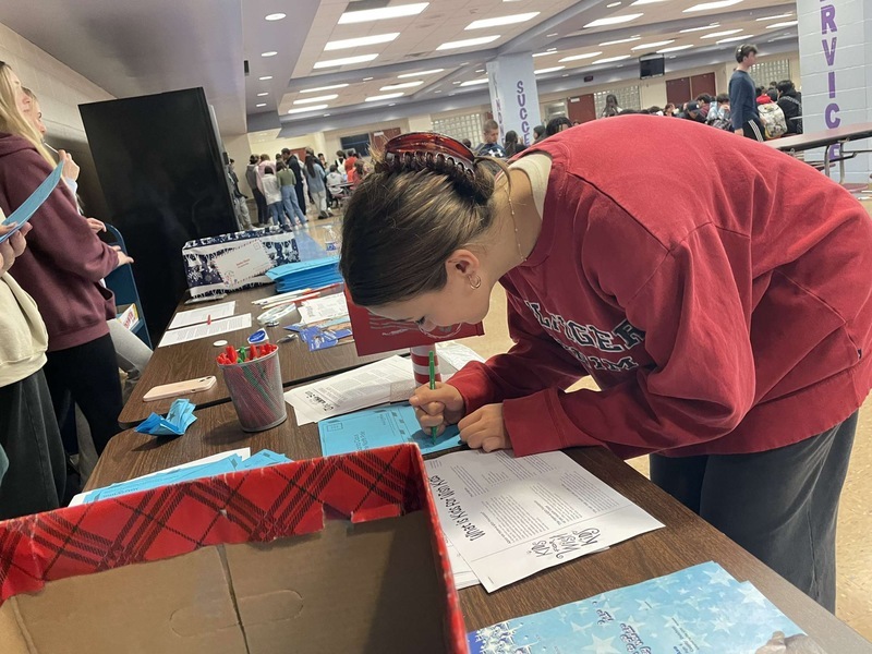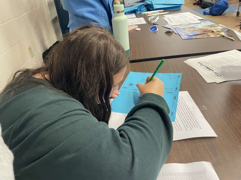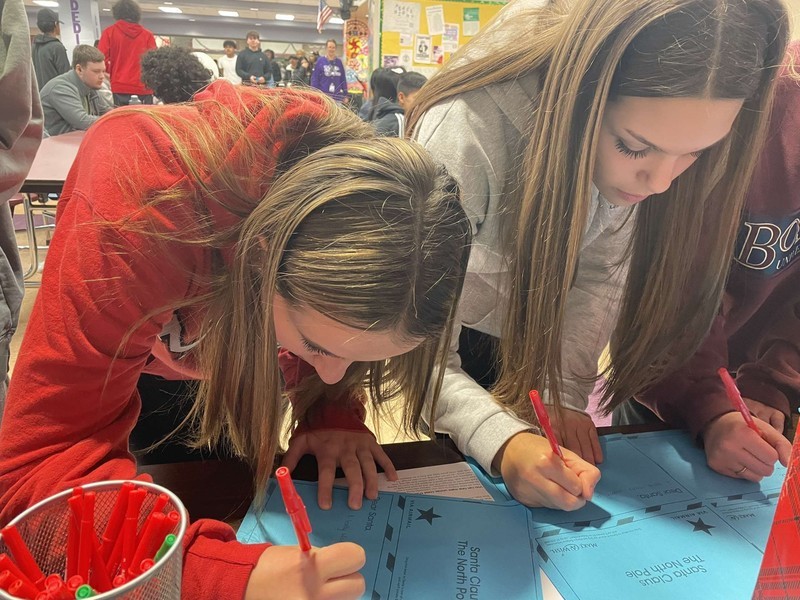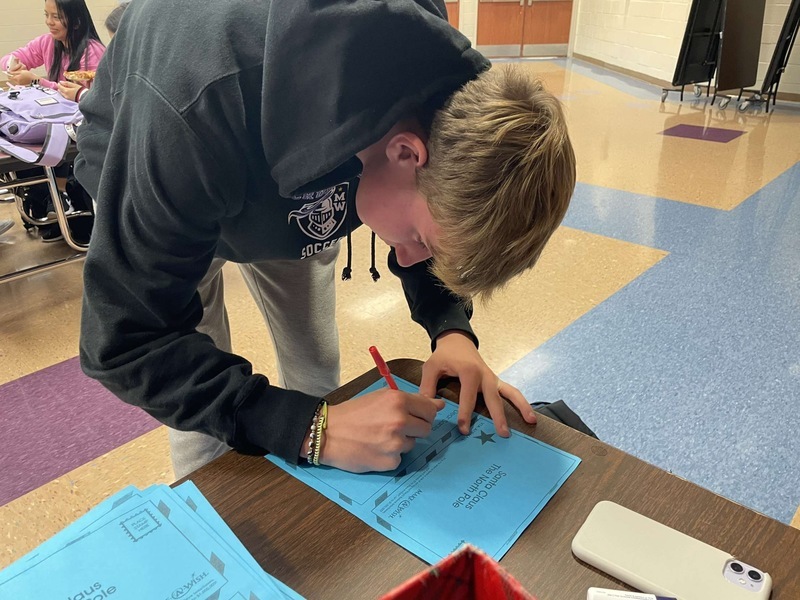 On Tuesday, December 6, hundreds of high school students and staff members shared their holiday wishlists for Santa at the annual letter writing event sponsored by the MWHS Chapters of Students Against Destructive Decisions (SADD) and Kids Changing the World (KCW). This event, sponsored by Macy's Believe campaign, encourages students and staff to write letters to Santa during their lunch periods. Each letter written earned Make*A*Wish a $2 donation from Macy's.