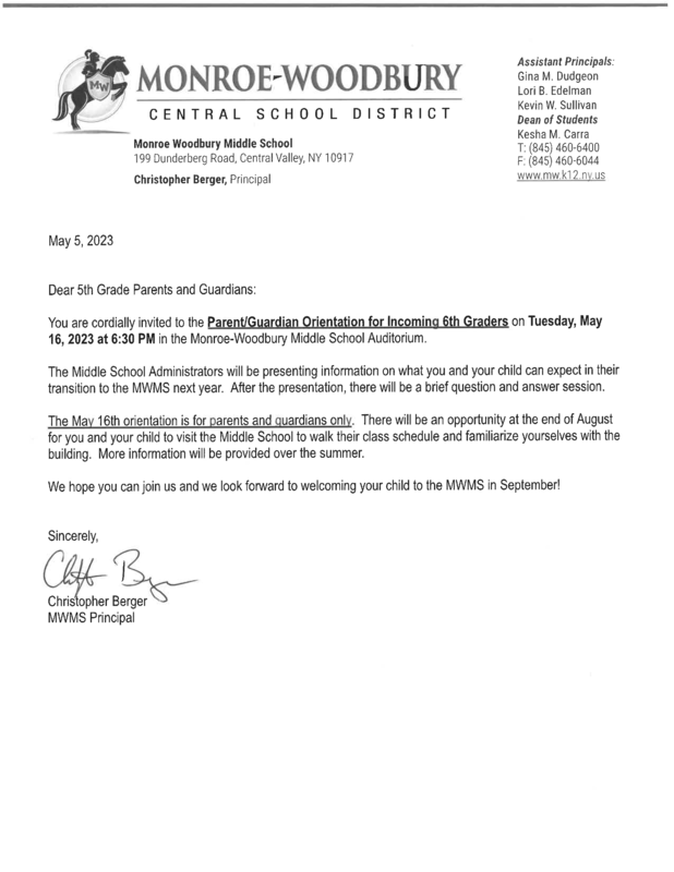 Parents and guardians of incoming 6th graders are invited to attend Orientation on Tuesday, May 16 at 6:30 p.m. in the middle school auditorium. Please note that this orientation is for parents and guardians only. We look forward to seeing you!