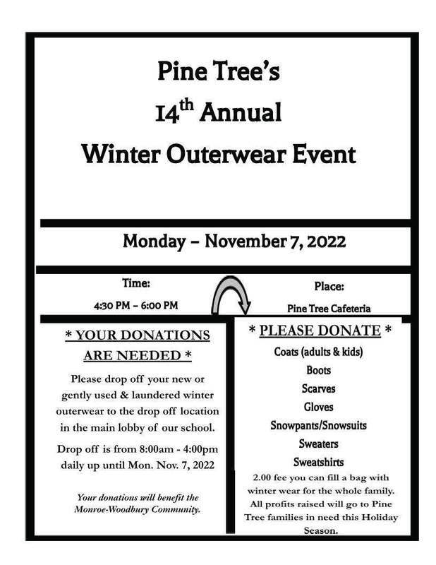 The Outerwear Event will take place on Monday, November 7 from 4:30 p.m. - 6 p.m. in the Pine Tree cafeteria. For a $2.00 fee, families may fill a bag with winter wear for the entire family. All profits will help Pine Tree families in need this holiday season.