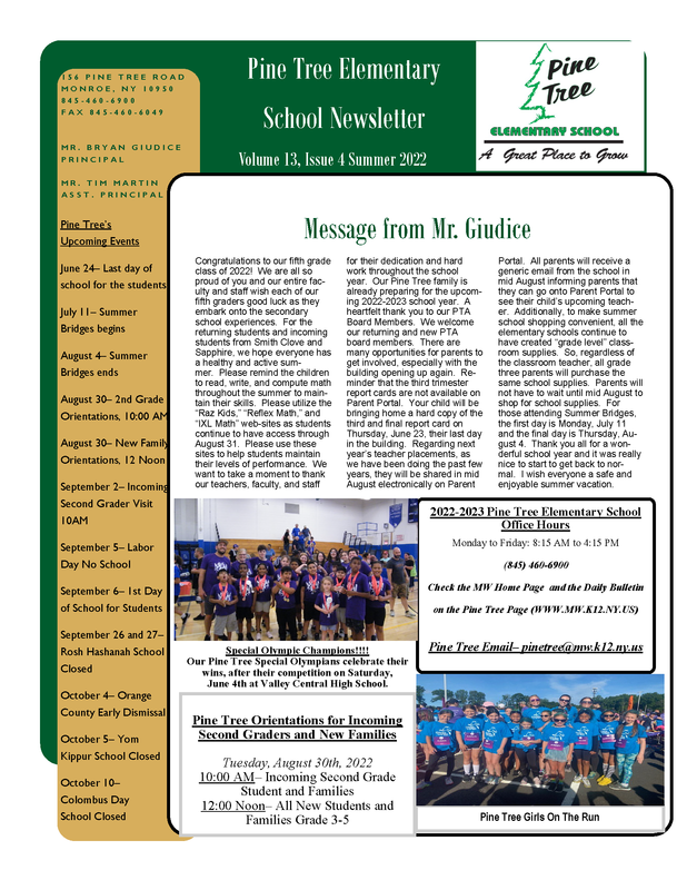 Don't miss the end-of-year issue of the Pine Tree Elementary School Newsletter. It has information about summer activities, fall teacher assignments, and lots of things you will want to know about Pine Tree.